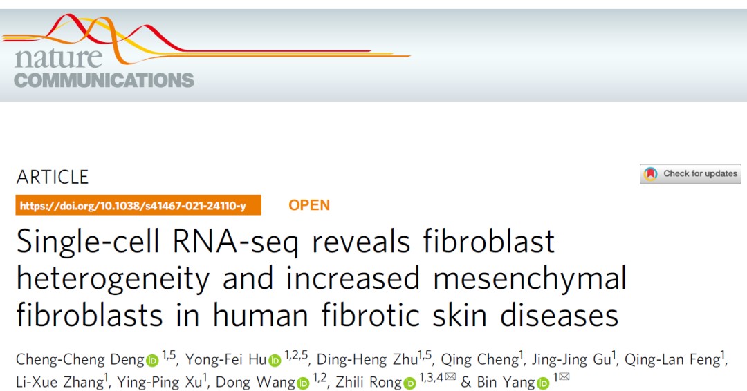1.解析了皮肤纤维化疾病中成纤维细胞的异质性,并发现mesenchymal成纤维细胞在皮肤纤维化疾病中显著升高,相关成果发表于Nature Communications杂志(IF=14.919)