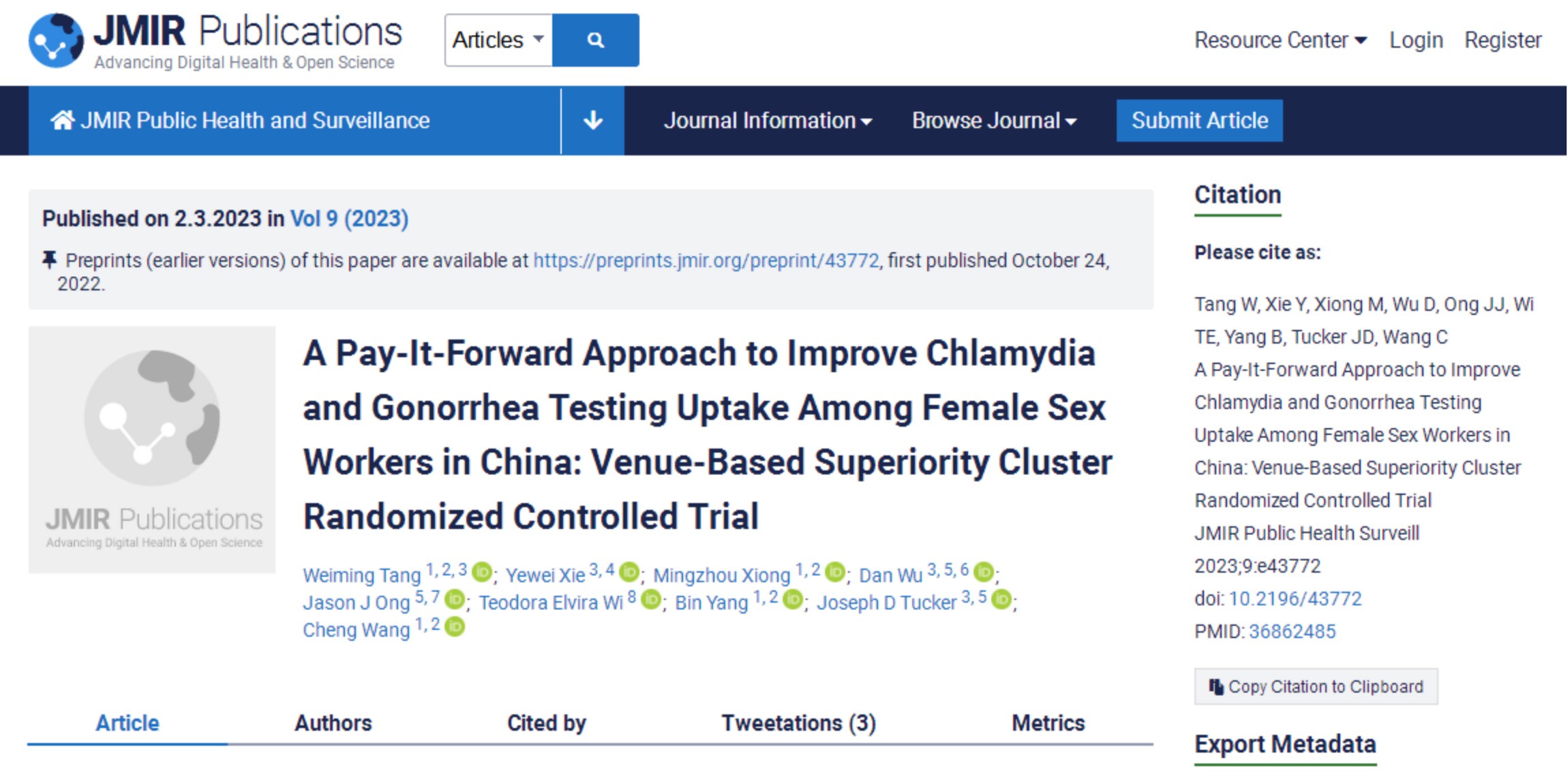 国际著名学术期刊《JMIR Public Health and Surveillance》(IF=14.557)在线发表题为《A