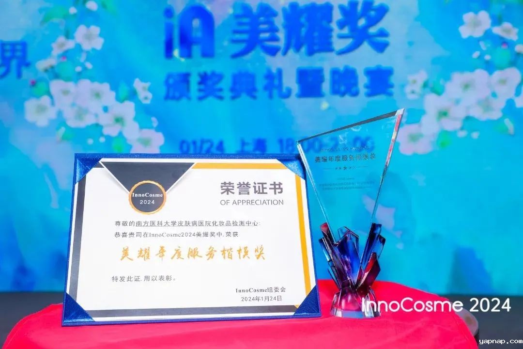 "InnoCosme Awards 美耀奖2024"共设置五大奖项,分别为美耀年度原料奖、美耀年度配方奖、美耀年度影响力媒体奖、美耀年度服务楷模奖、美耀年度匠心工程师奖。【化妆品检测中心简介】