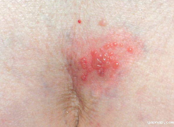 典型症状:1.生殖器及肛周区域水疱、溃疡;2.首次感染常伴发热、腹股沟淋巴结肿大。生殖器疱疹的复发频率通常高于单纯疱疹。