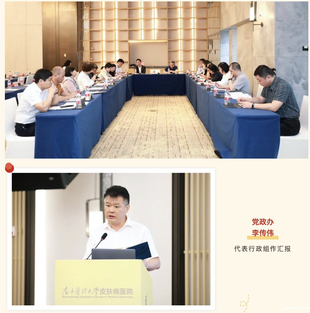 皮肤内科等9个科室代表作工作汇报,详细介绍了学科建设、专科专病发展思路、信息化建设、全球健康工作、白云院区及江高院区的建设规划与进展等。